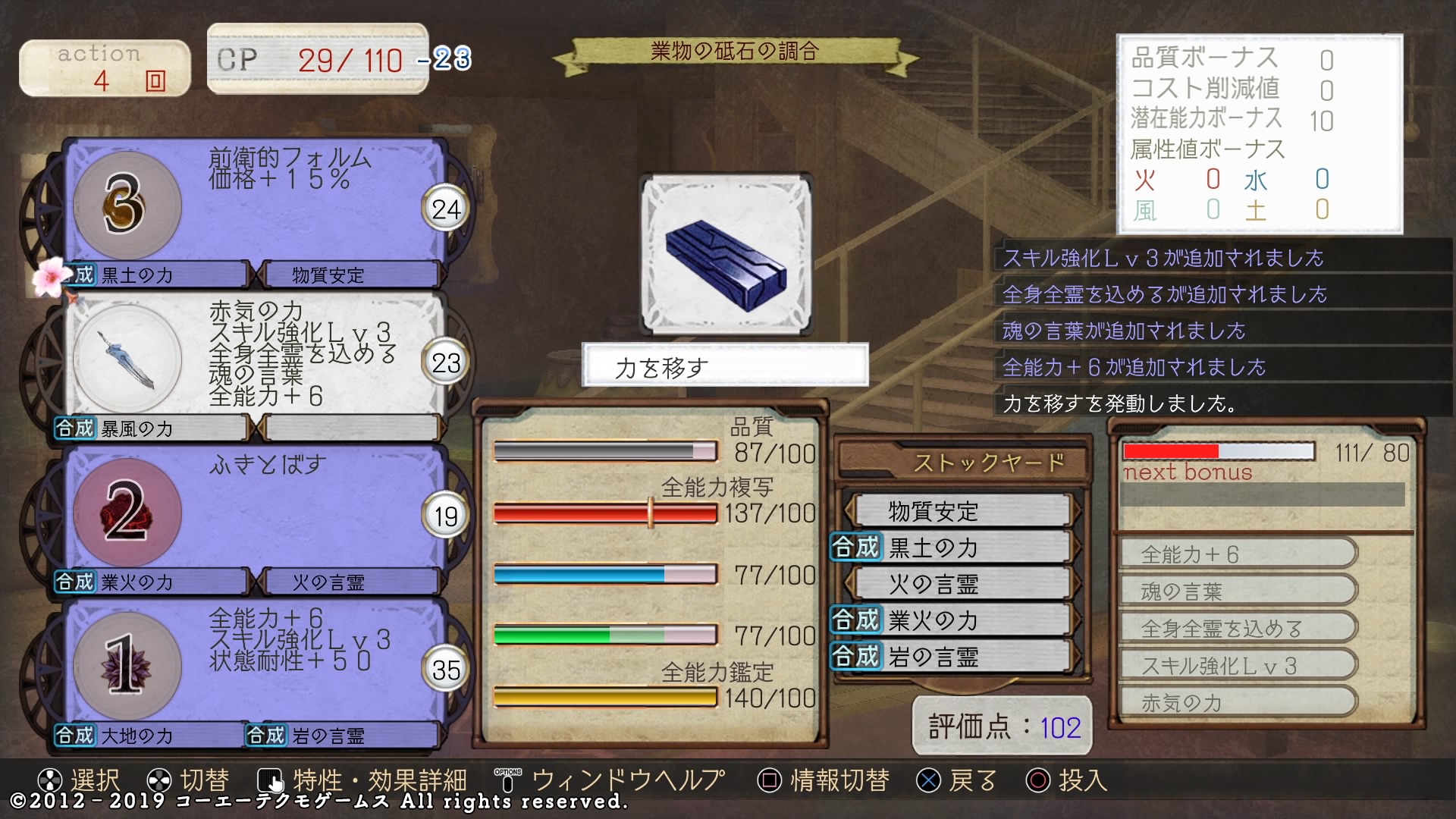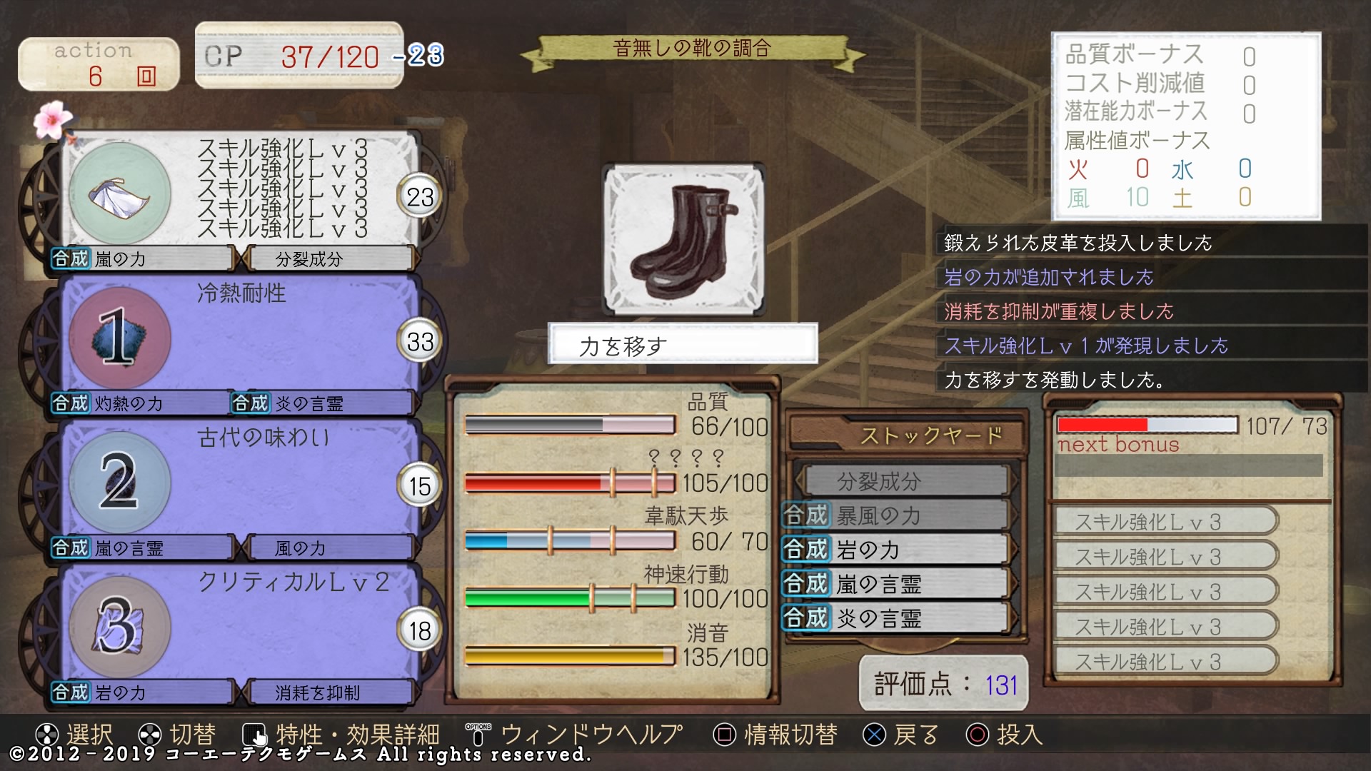 装備を作りこむ途中、持ってない潜在能力を探しに採取に行ったり、まさかのレシピ取り逃しで探しに行ったりと調合以外にも思わぬ時間を取られ、4月1日のタイムリミットも迫ってくるのでとてもハラハラしました