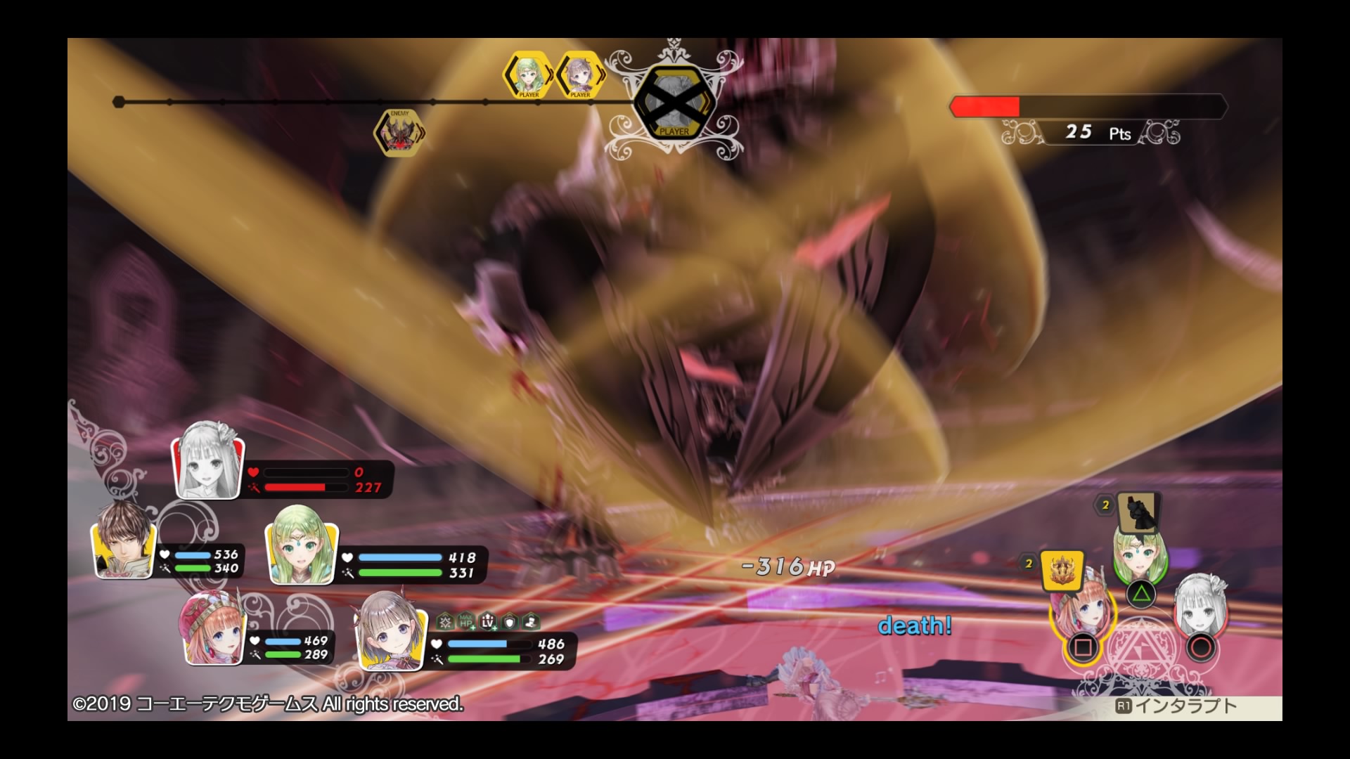錬金術士3人のインタラプトには攻撃アイテムをセットしてたんですが、ラスボス戦では攻撃アイテムを投げまくっても戦況は好転せず、強大なボスとの戦いでは攻撃ではなく回復アイテムをセットした方が良いことを学びました