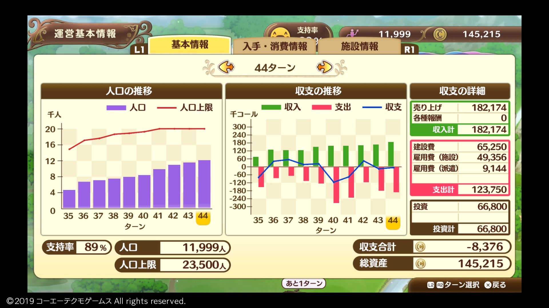 序盤は資金に余裕があって好きなだけ施設を建設してましたが、終盤になり豪華な施設を建てようとすると、普通の施設の100倍以上の資金が必要となり、周回ボーナスでちょっと資金が増えたくらいじゃ賄いきれず、建設が思うように進んでないのが今の状況です