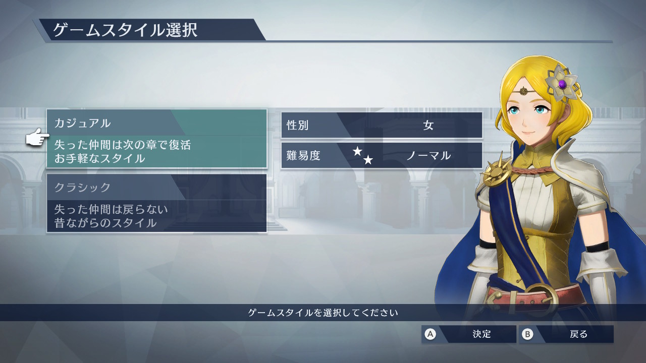 普段のFEなら戦闘不能になった仲間がロストするクラシックを選ぶところだけど、今回は慣れないアクションゲームで、不慮の事故で何が起こったかもわからず仲間がロストするのは面白くないのでカジュアルを選択します
