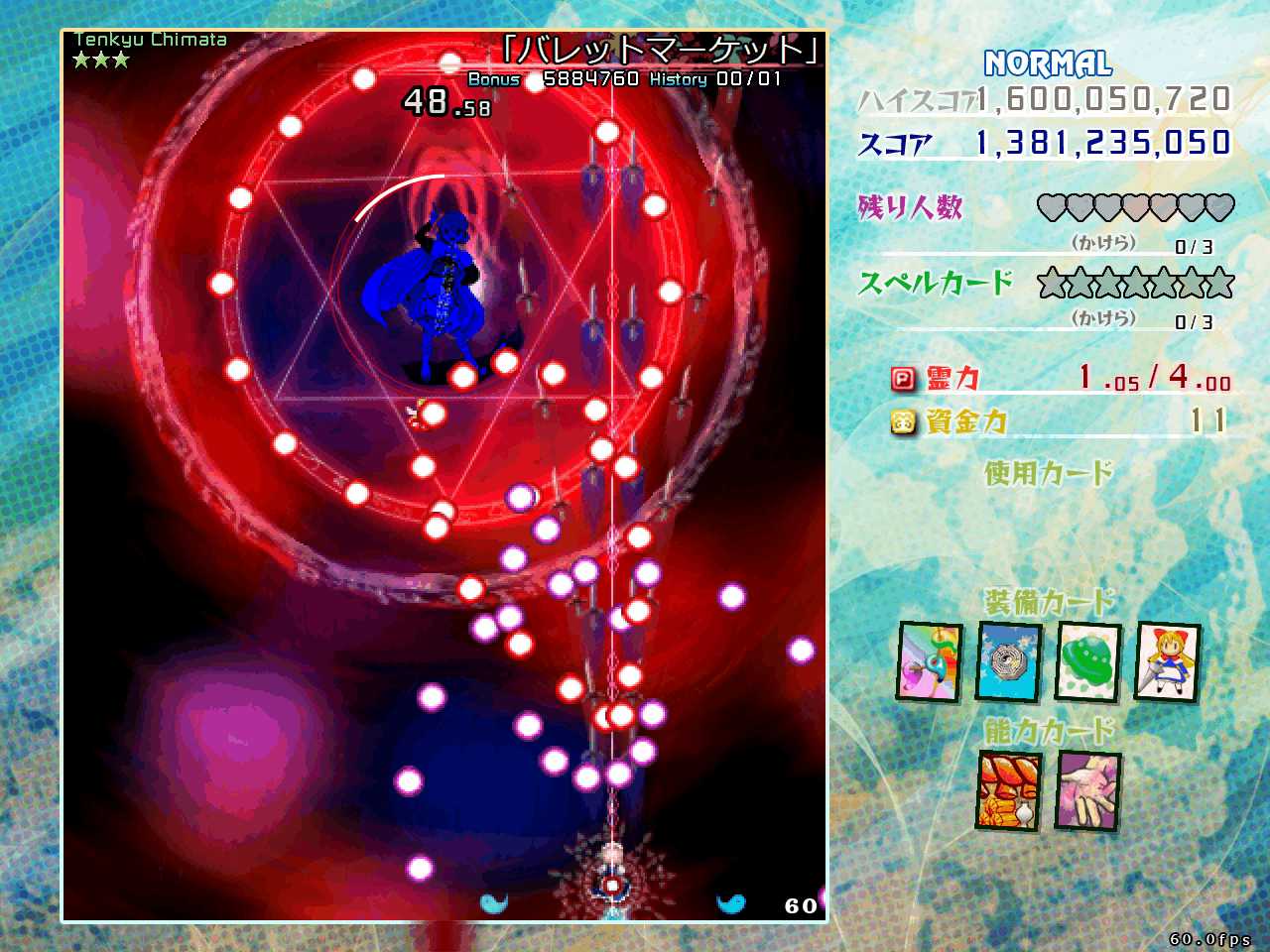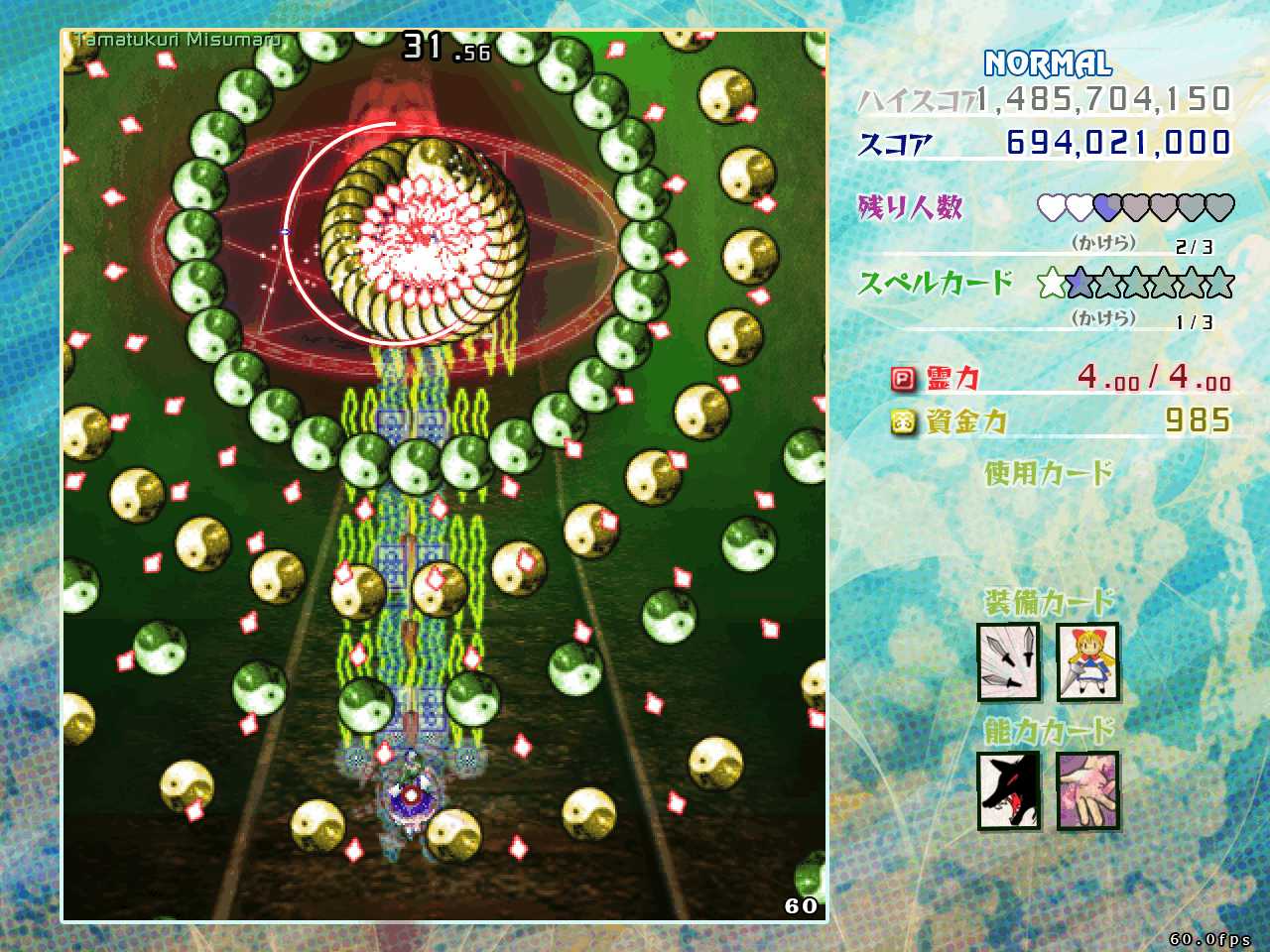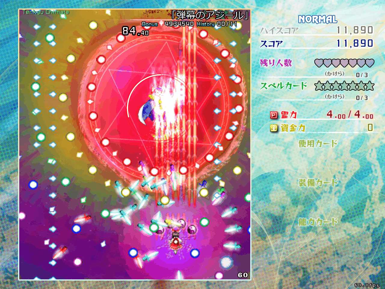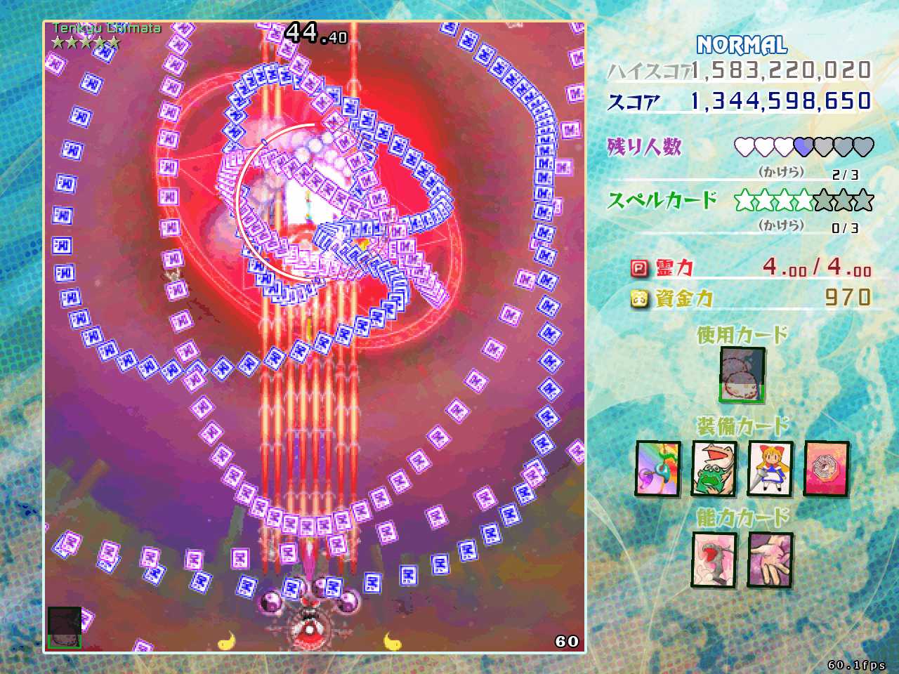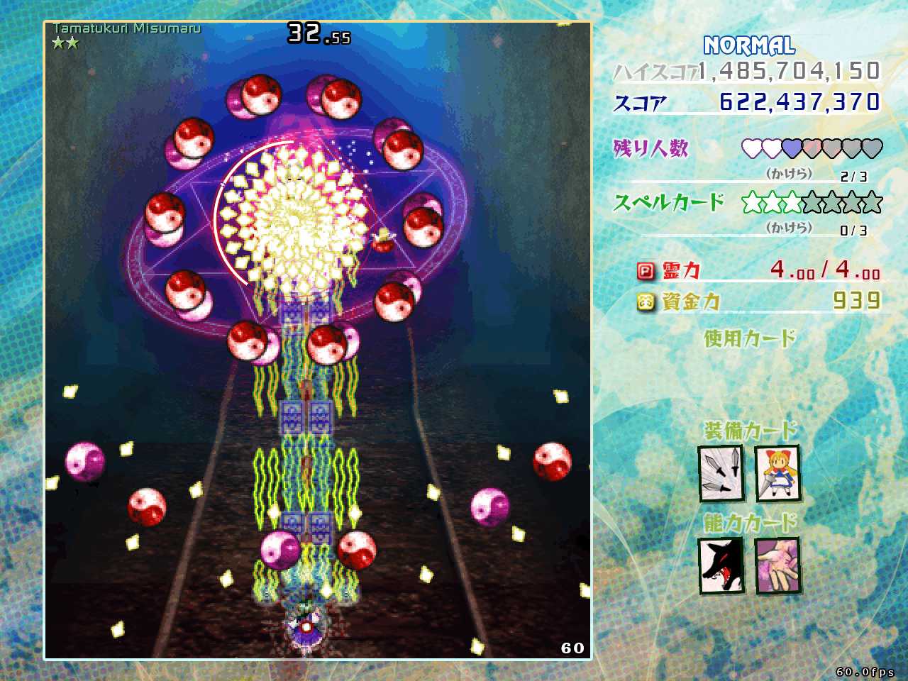 ただ、時間が経過するとボスが降りてきてショットが当たるようになるので厳密には耐久スペルではなく、永夜抄の霊夢のラストスペルのような一定時間で無敵状態が解除されるパターンです