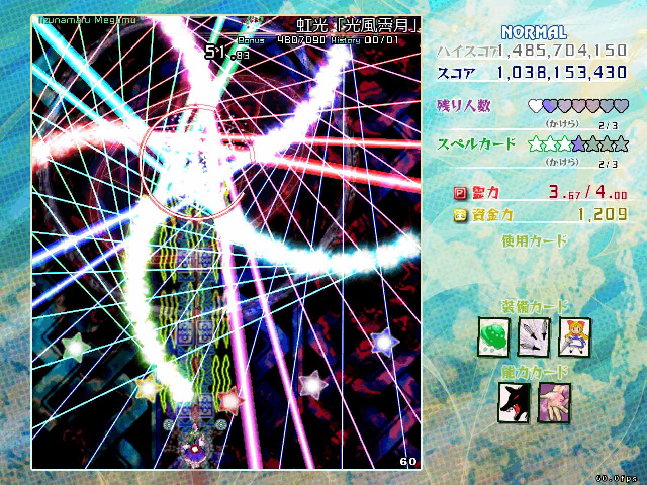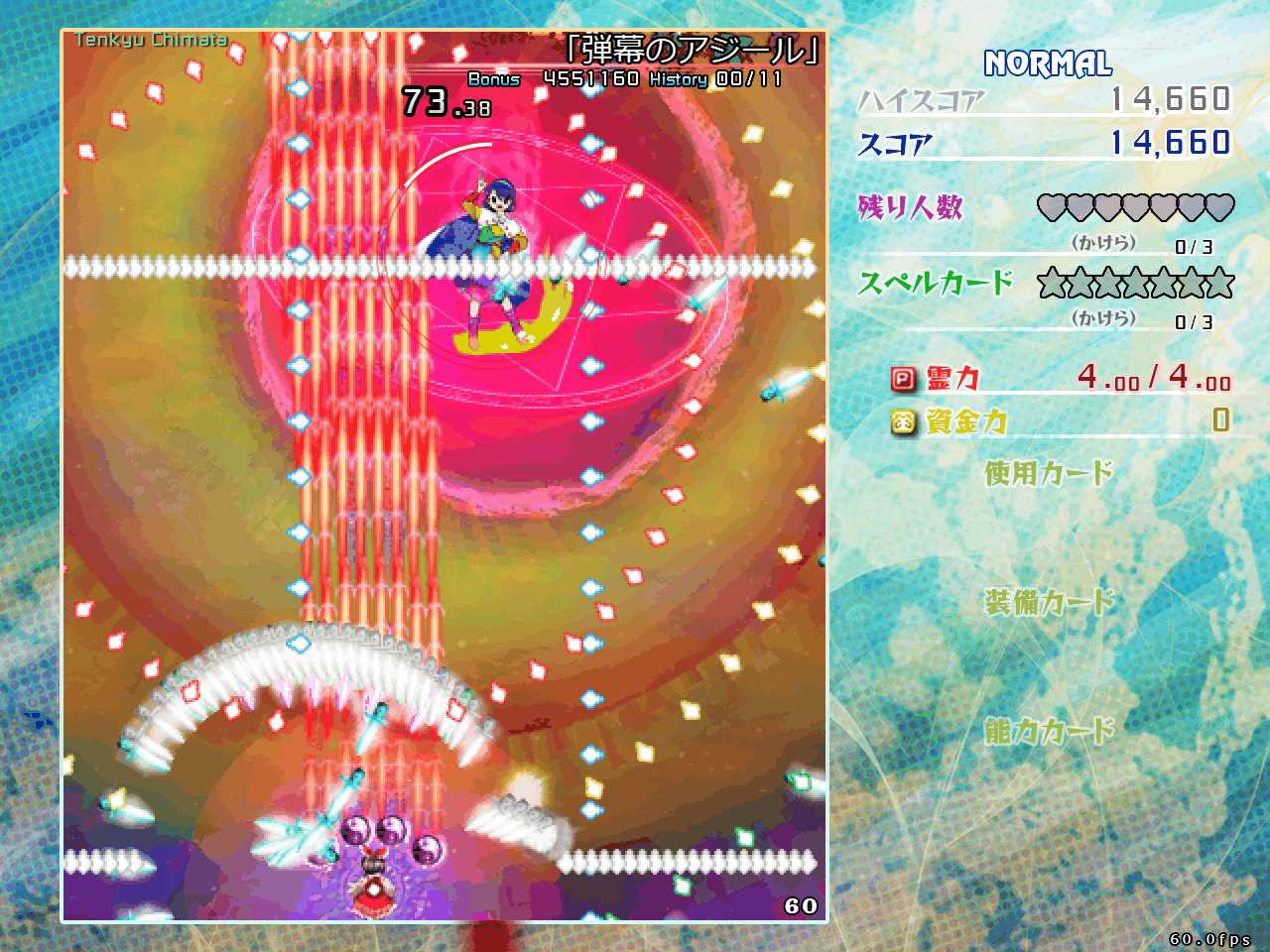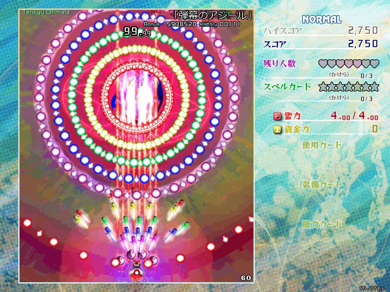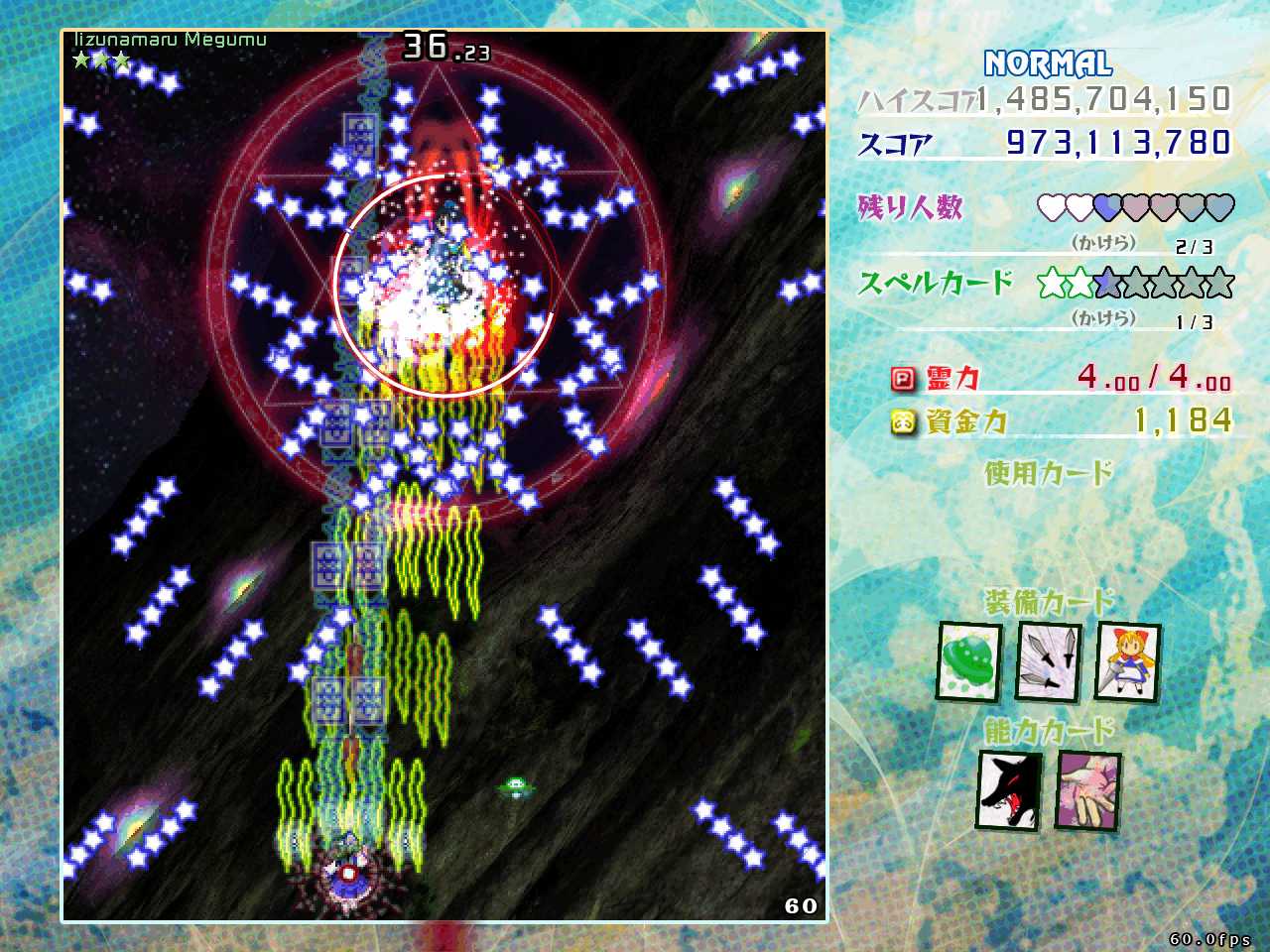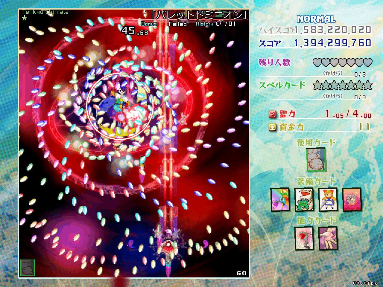 ただ、時間が経過するとボスが降りてきてショットが当たるようになるので厳密には耐久スペルではなく、永夜抄の霊夢のラストスペルのような一定時間で無敵状態が解除されるパターンです