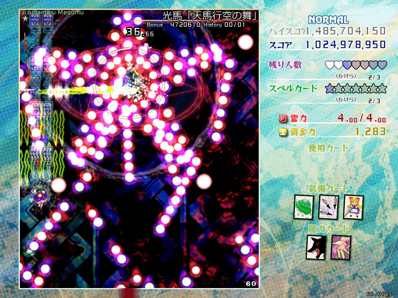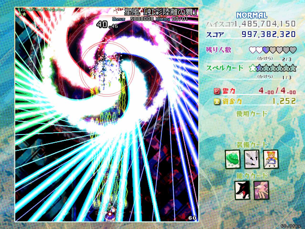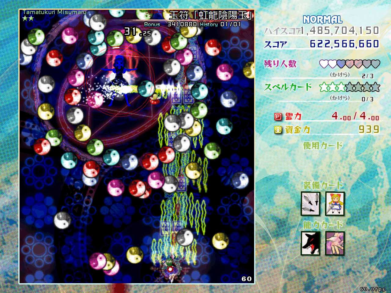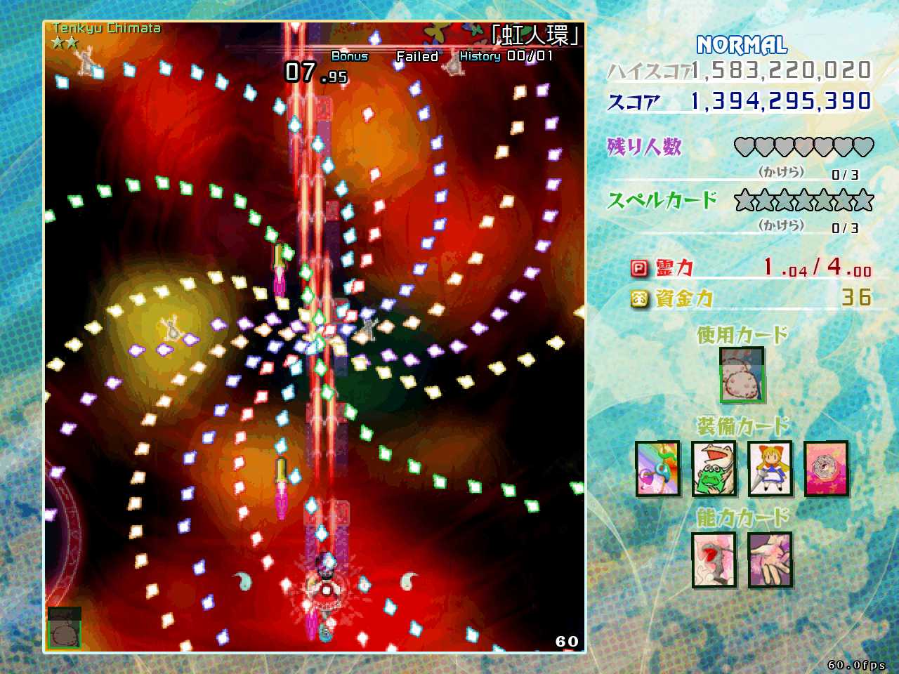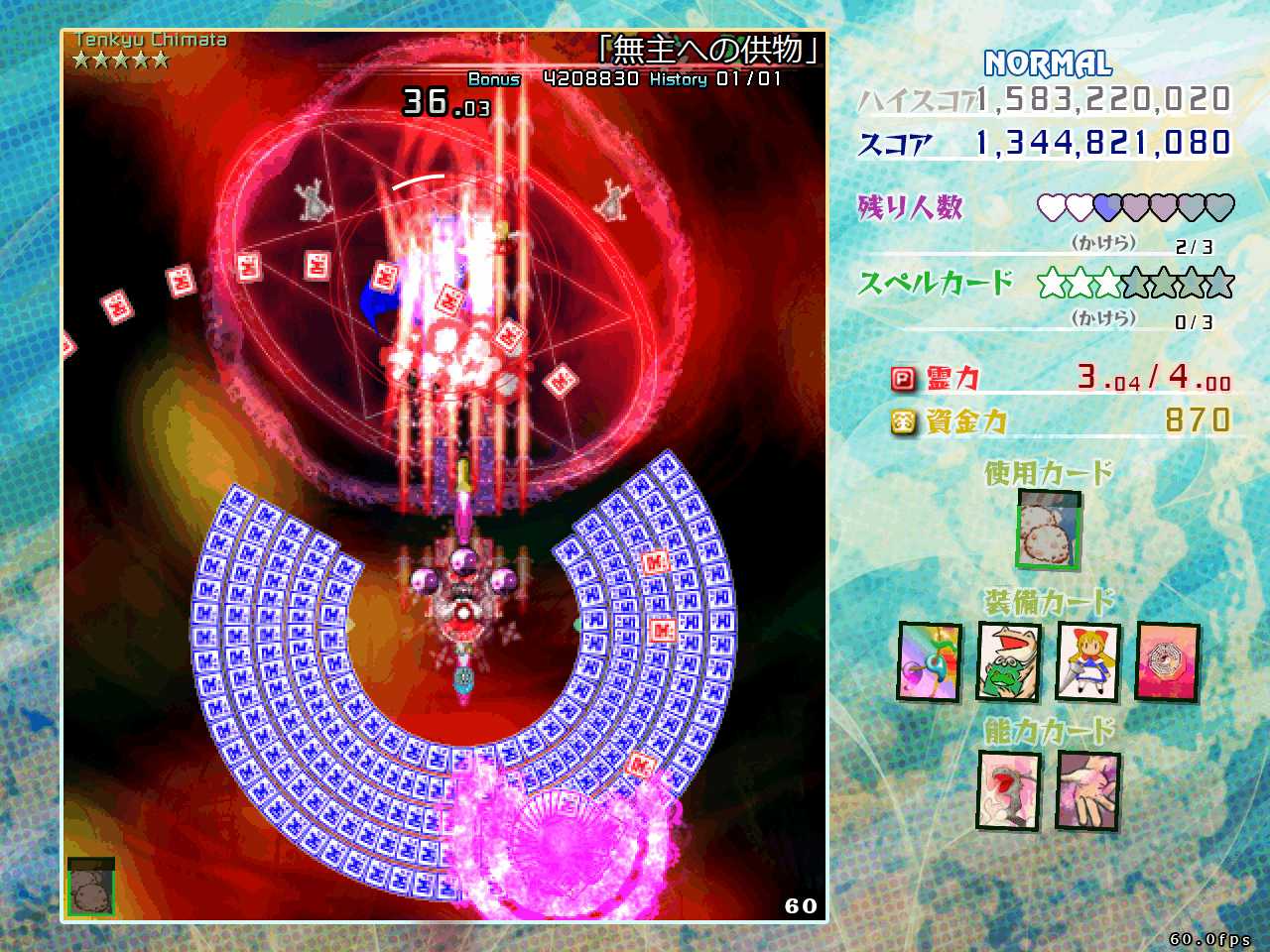 ただ、時間が経過するとボスが降りてきてショットが当たるようになるので厳密には耐久スペルではなく、永夜抄の霊夢のラストスペルのような一定時間で無敵状態が解除されるパターンです