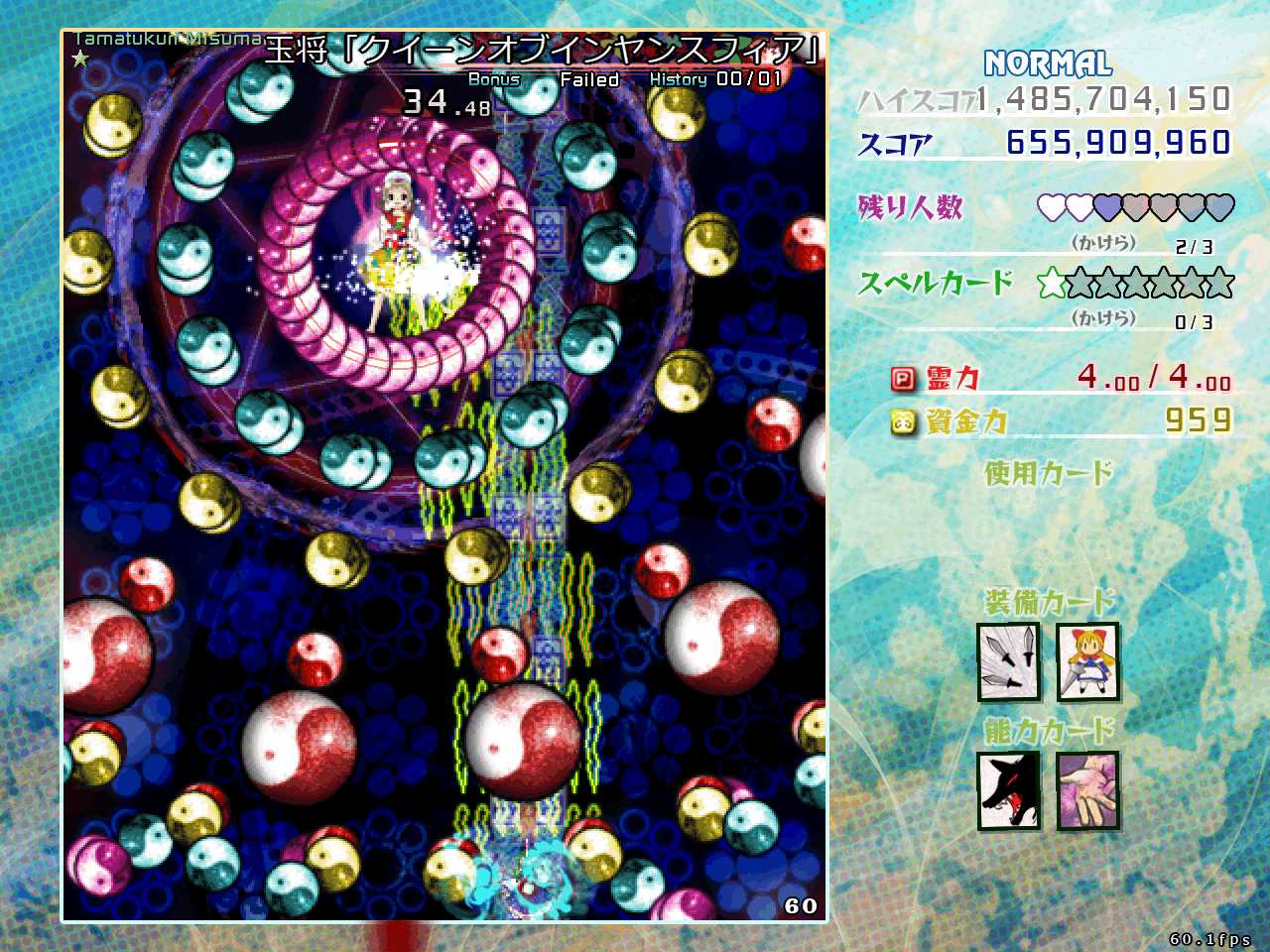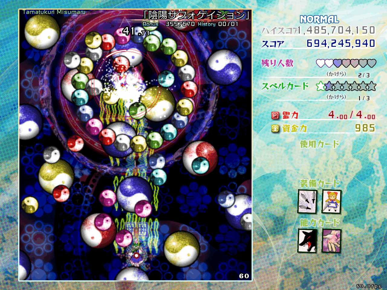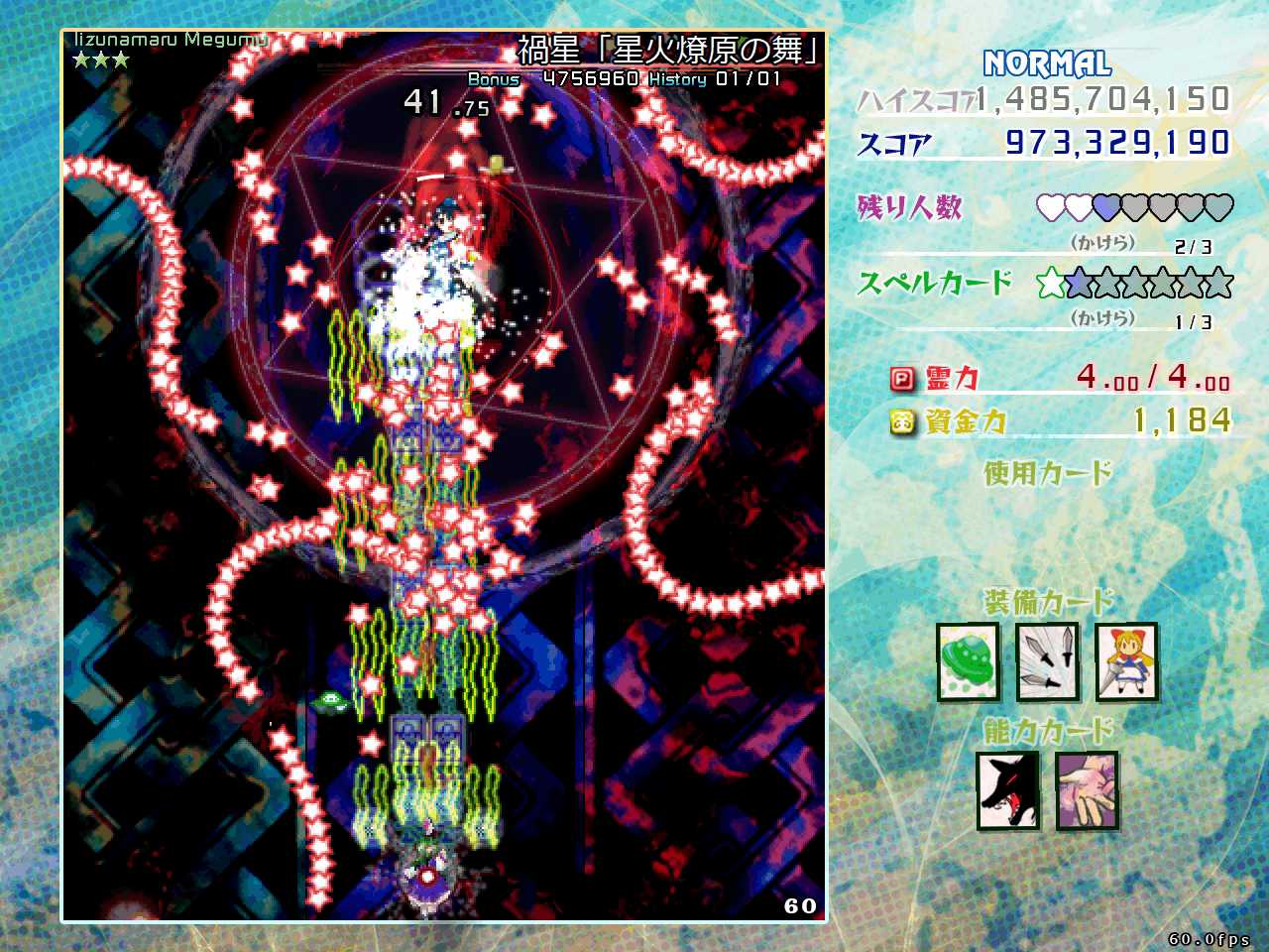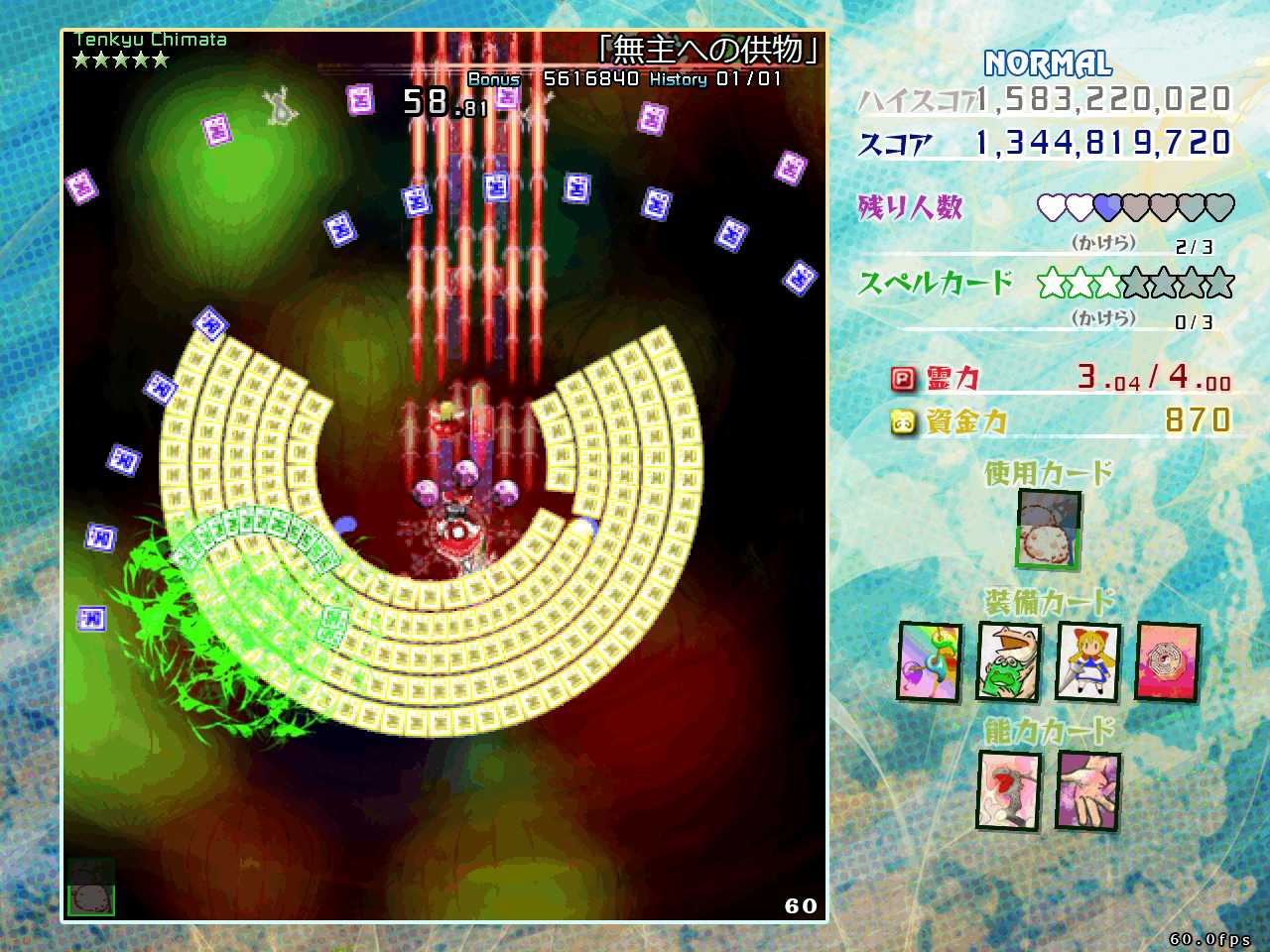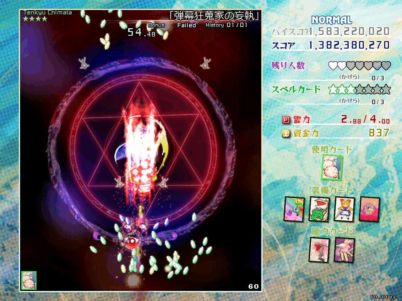 ただ、時間が経過するとボスが降りてきてショットが当たるようになるので厳密には耐久スペルではなく、永夜抄の霊夢のラストスペルのような一定時間で無敵状態が解除されるパターンです