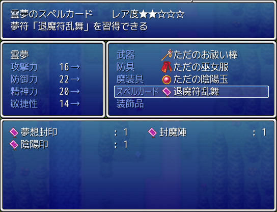 ここでいうスペルカードとは、装備画面の「スペルカード」という項目に装備することになるアイテムの事です。