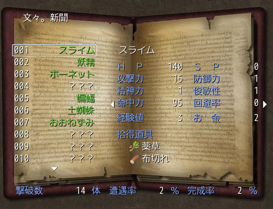 敵を倒すとステータスやドロップアイテムといった基本的な情報が載りますが、文が習得するスペル、取材「射命丸文の圧迫取材」を使用することで、使用した妖怪のさらに詳細な情報が開示されます。
