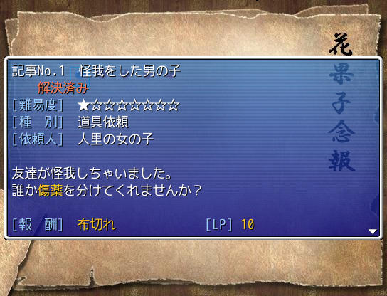花果子念報には幻想郷に住む人間や妖怪たちの悩み事に関する記事が、依頼という形式で書かれています。