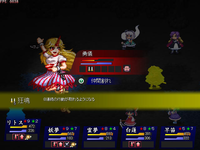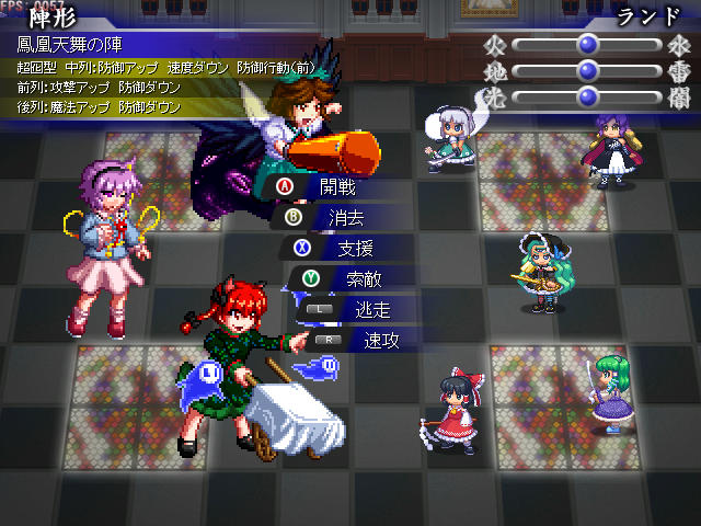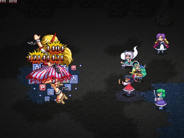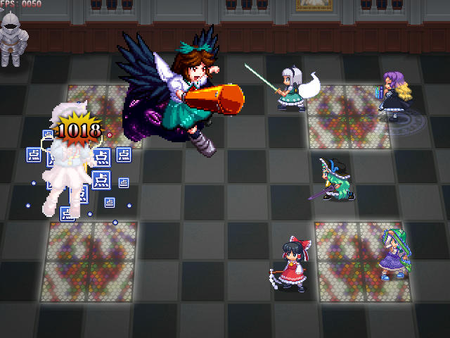 幽々子は回避が非常に高く、咲夜だと直撃のゴーグルⅣをつけてもほとんど攻撃があたらないにとりのスピットファイアや属性付きのスペカなら命中補正で安定してダメージを与えられる