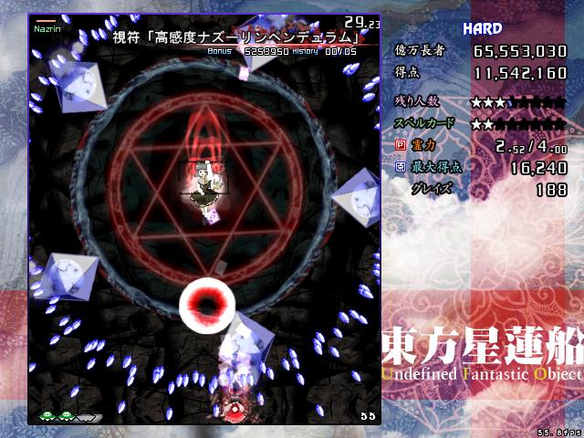 これはノーマルの弾幕に水平方向に飛んでくる青弾が追加されたもの。不慣れな人にとっては鬼畜な弾幕かもしれないが、ノーマルでこのスペカを安定して取れるならばハードでも取得は難しくない。