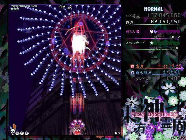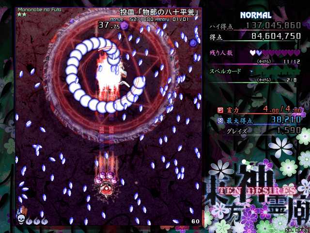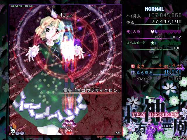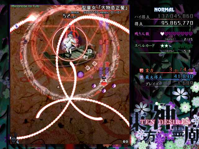 3本の紐状の弾幕によって自機を束縛され、時計回りに回転しながらランダムに飛んでくる札弾を避けるというもの