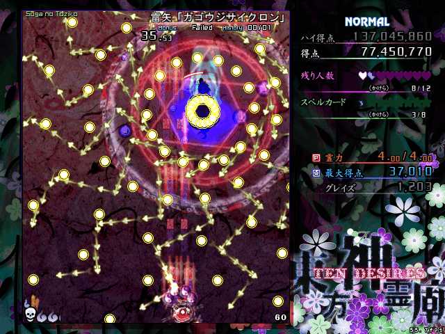 ただの気合避けかと思ったら、黄色い炎弾は弾源が自機に向かって降りてくるため、動かずに構えていると気付かないうちにミスになっている