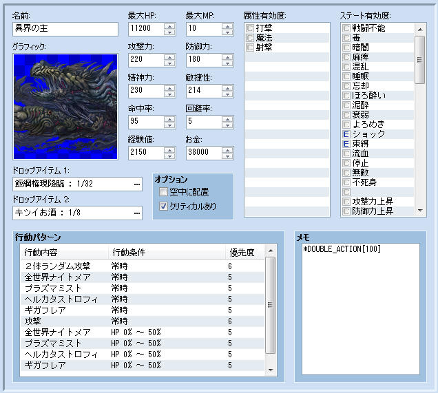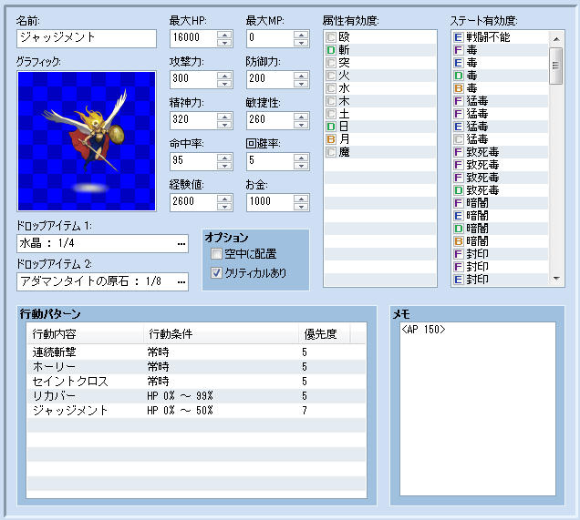 んで、さっきラスダンの敵のステータスを一通り設定してみたので、どんなもんなのかお見せすることにします