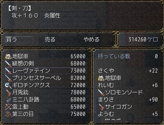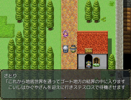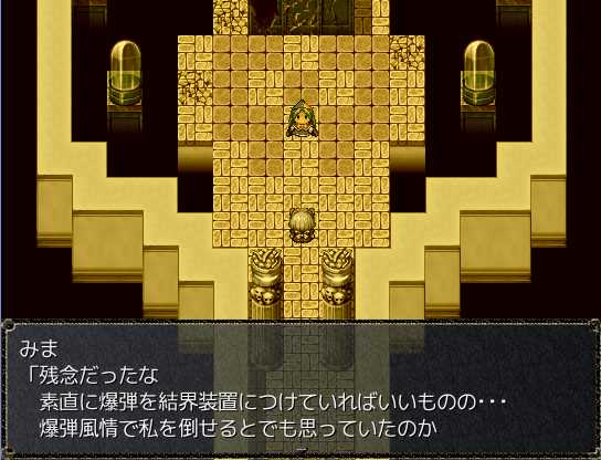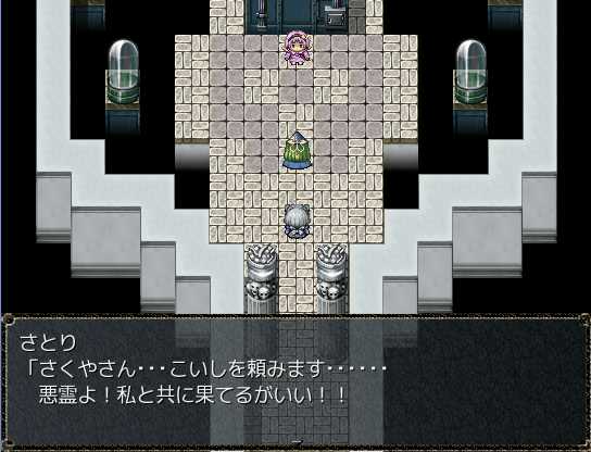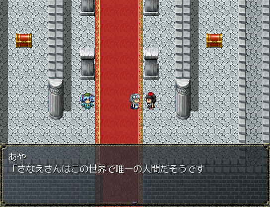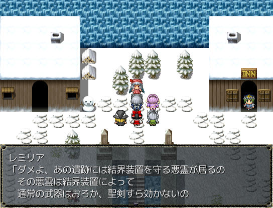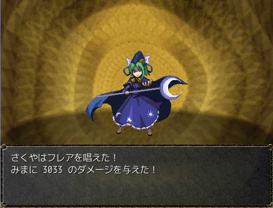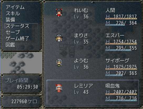 雲の町クラウド そういえば異世界では人間を見かけないななぜ人間のさなえさんが玉座に座ってるんだろう?ポートルの町でさとりと合流 これから地底世界に行くらしい 東方の幻想風穴みたい穴の中に入るとそこはまさに地底の世界で、マップはワールドマップと同じ扱いだ地底世界にはダンジョンや町もあるぞ地底世界の武器屋 あれ?これって普通に東方のネタだよね?地底世界を抜けゴート地方へ 咲夜たちを過去へ逃がしたレミリアとついに再会結界装置を守るみまと戦う 攻撃が全く効かない!?なっ!?さとり、まさか死ぬ気か!?そんな… さとりは犬死だったというのか…?さとりの捨て身の攻撃が効いたのか、今度はこちらの攻撃が通じるようにさとり!どうやら生きてるみたいだ!いやいや、生きてて良かったよ~レミリアが仲間になった ステータスもスキルも超強い!