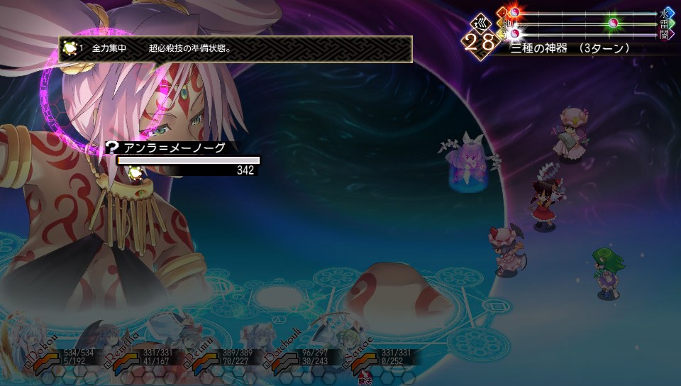 ルイズは単体に強力な四属性魔法を放ってきますが、基本的にはそれだけで、イージスの盾と耐性アクセを装備した霊夢にプロパケイションで囮になってもらい、あとは普通に殴って倒しました