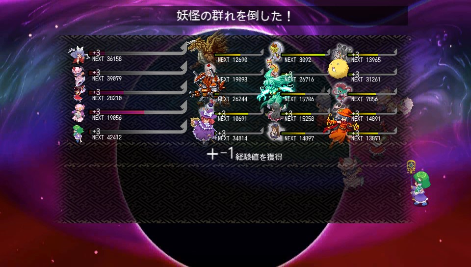 ここにきて妹紅と早苗のMPが完全に尽きてしまい、通常攻撃しかできないほどになってしまったんですが、最後は残っているスペルカードを総投入して押し切りました!!